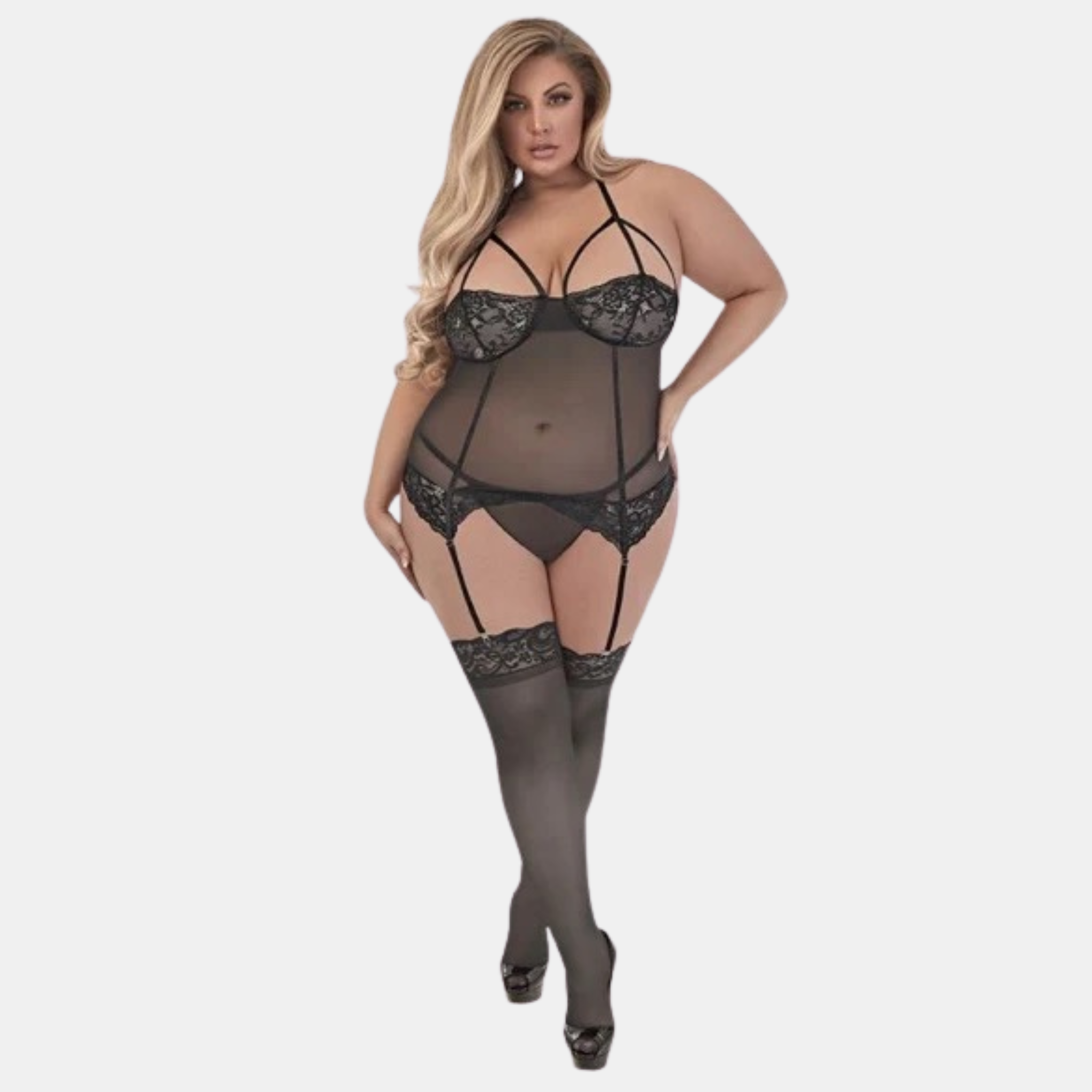 Þetta fallega sett samanstendur af korseletti úr gegnsæu efni skreytt blúndu yfir brjóstin & g-streng spangir eru í korselettinu & gefur góðan stuðning og lyftir brjóstunum upp. Stillanlegir hlýrar eru yfir öxlunum & einnig er hægt að stilla sokkaböndin.