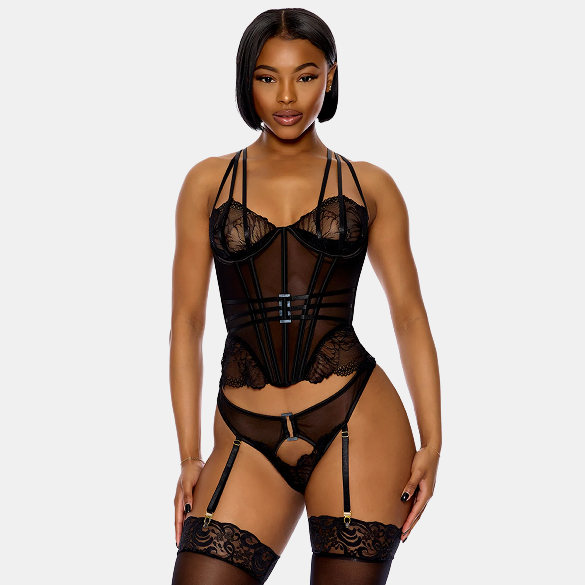 Fallegt korselett & sætar nærbuxur með áföstum sokkaböndum. Það er vönduð blúnda & blómasniði í bland við svart hálf gegnsætt efni sem gerir þetta sett alveg æðislegt. Bönd draga saman mittið sem festast í fallega sylgju að framan. Þrjú bönd koma upp axlirnar sem tengjast í stillanlega hlýra. Vandaður innfeldur rennilás er niður bakið sem tryggir að hann leggst þétt að líkamanum. Hann ýkir mittislínuna fallega á sama tíma & það veitir brjóstunum góðan stuðning & lyftir þeim upp. Nærbuxurnar eru einnig með fallegri sylgju að framan í stíl við korselettið & eru þær líka með fallegri blúndu.