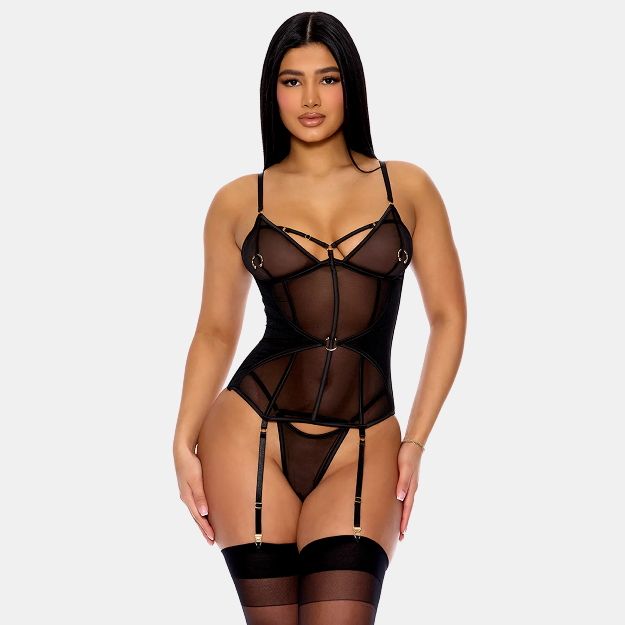 Svart kynþokkafullt sett sem samanstendur af korseletti með stillanlegum áföstum sokkaböndum & G-streng í stíl. Korselettið er skreytt með flottu skarti að framan, teygja liggur undir brjóstunum & kemur með stillanlegum hlýrum, fest með krækju. Ýkir mittslínu & gefur brjóstunum gott aðhald, virkilega sexy sett.