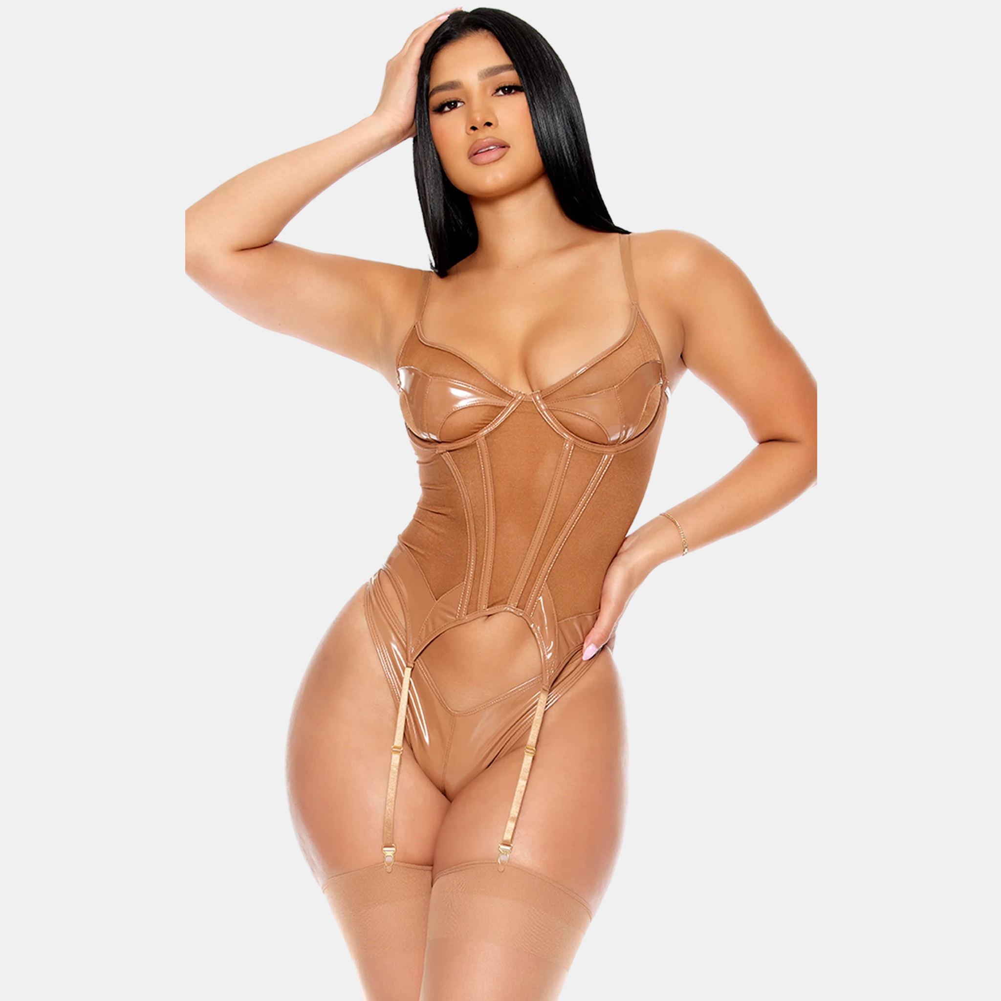 Korselett með mjög fallegu sniði úr mjúku hálf gegnsæu brúnu efni & glansandi vínyl. Stillanlegir hlýrar koma yfir axlirnar og er það með vönduðum krækjum upp bakið sem sjá til þess að það haldist á sínum stað, það leggst vel að líkamanum & ýkir mittislínuna fallega. Áföst sokkabönd sem eru auðstillanleg tryggja svo að hægt sé að festa flestar gerðið uppháa sokka við. G-Strengur fylgir einnig settinu í sama stíl. Ekkert smá flott sett!