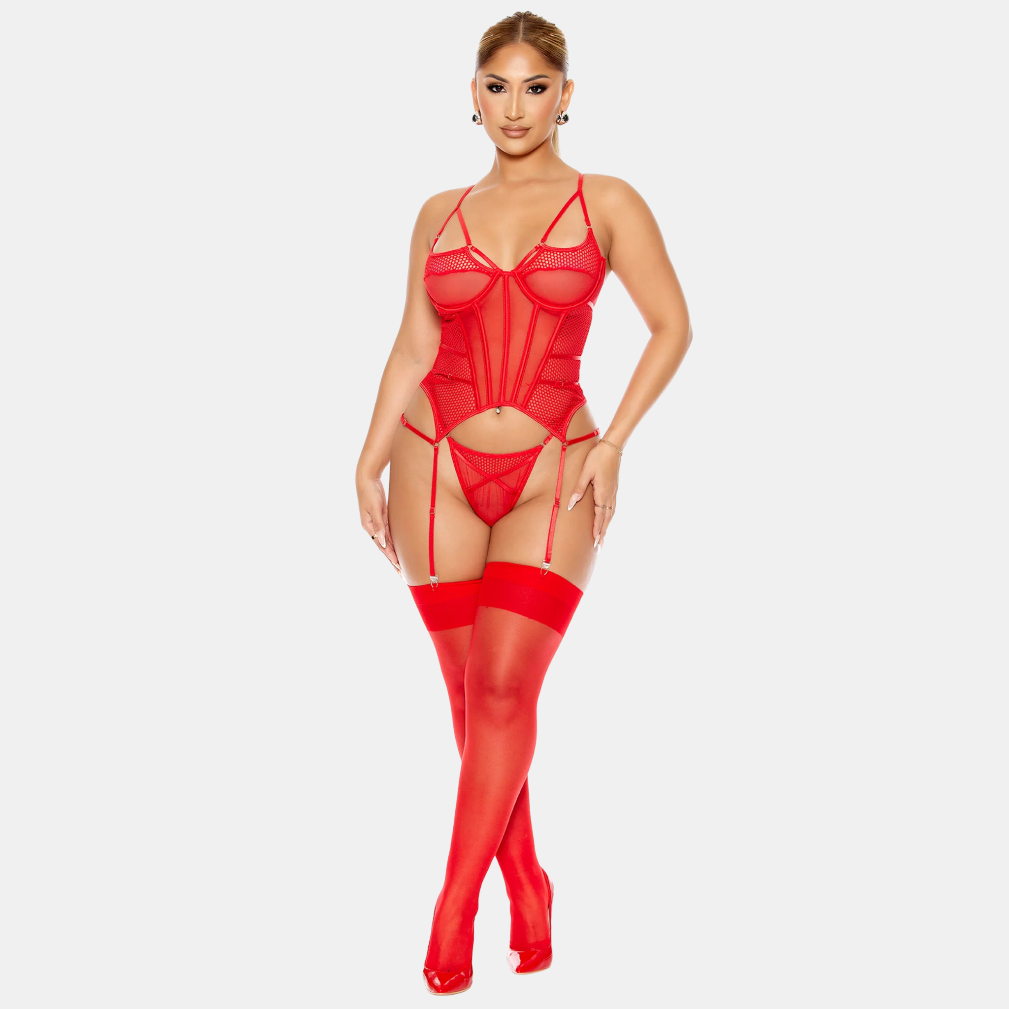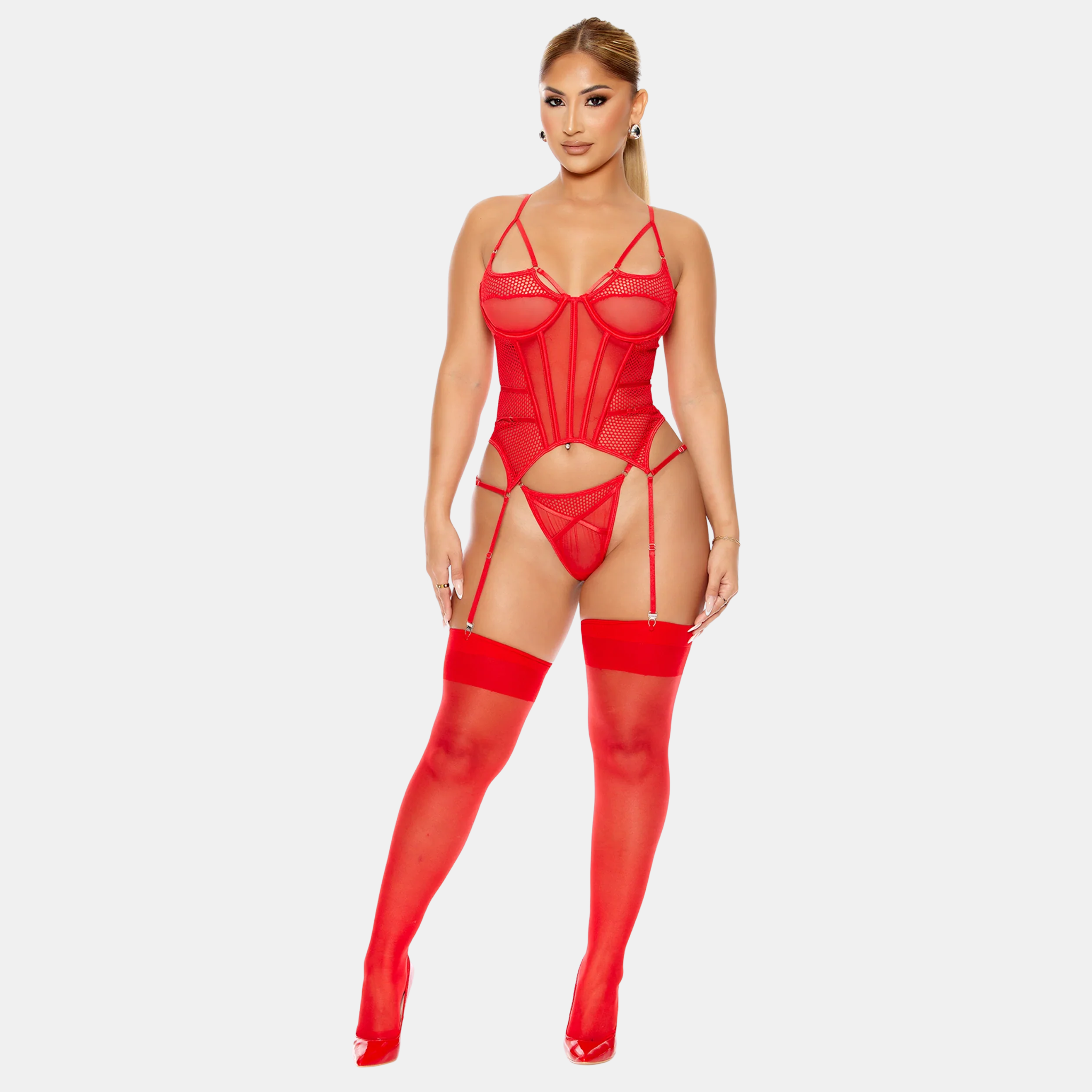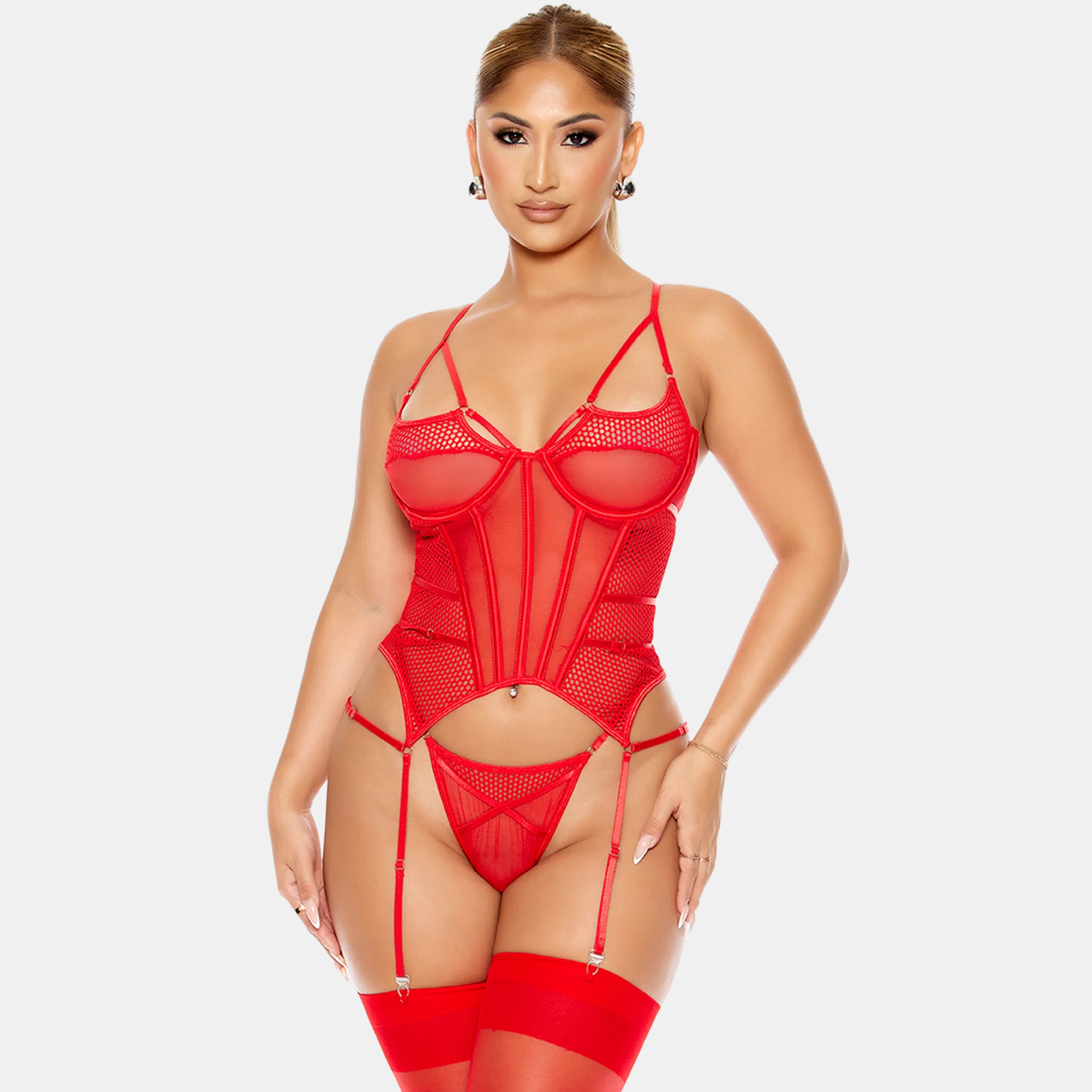 Þetta kynþokkafulla sett samanstendur af korseletti með stillanlegum áföstum sokkaböndum & G-streng í stíl. Korselettið er með afar fallegu tvískiptu sniði sem ýkir mittislínuna & leggst þétt að líkamanum. Korselettið er með O-laga netamynstur samhliða hálfgegnæu mjúku brúnu efni, er með spöng & stillanlegum hlýrum sem veita brjóstunum góðan stuðning & lyfta þeim upp.