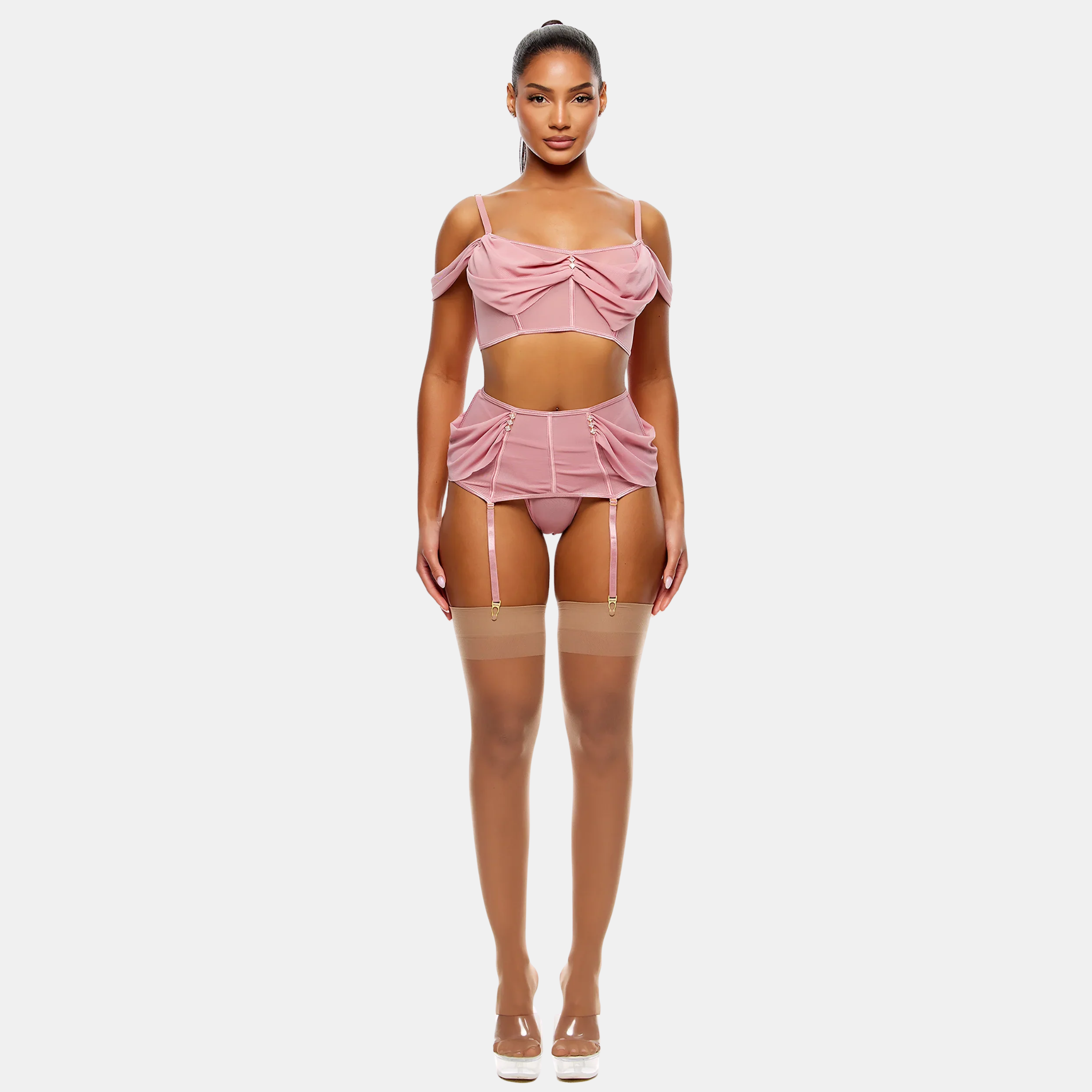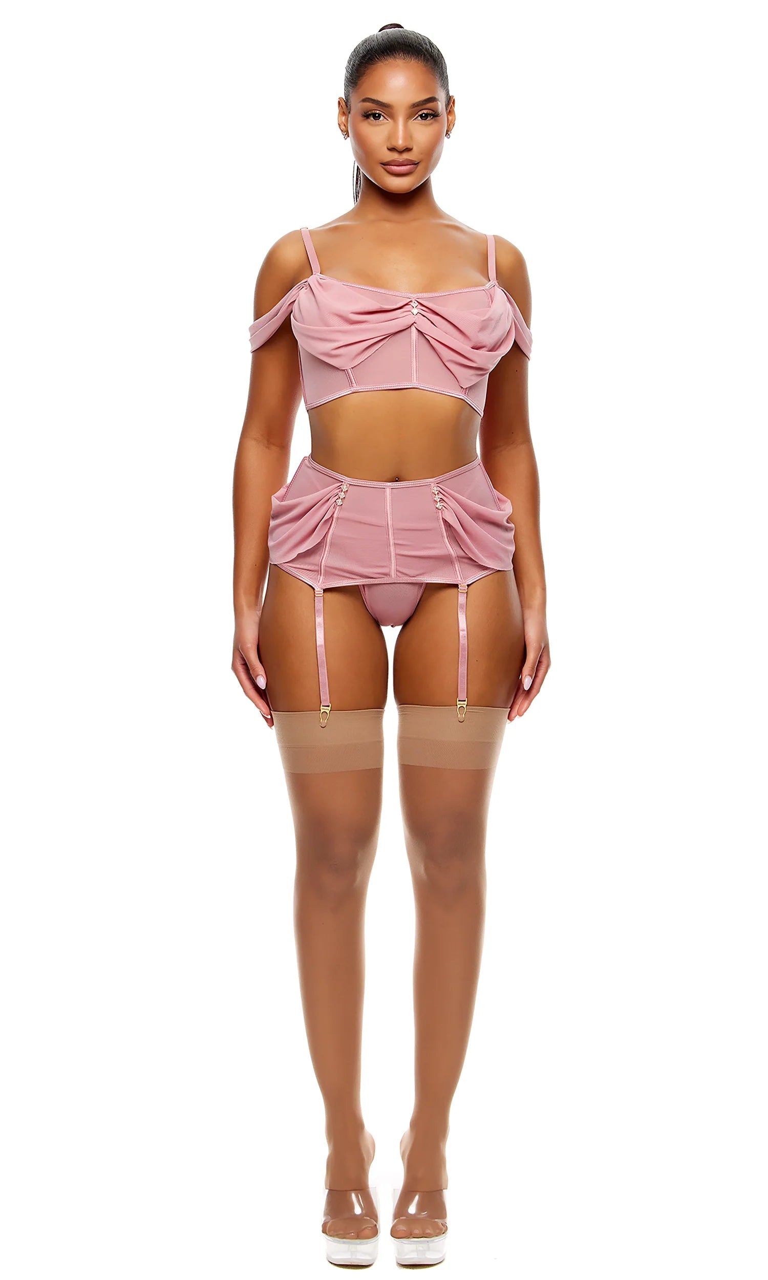 3-piece sheer mesh bra and garter skirt and matching panty set with draped mesh detail and rhinestone accents and boning detail.