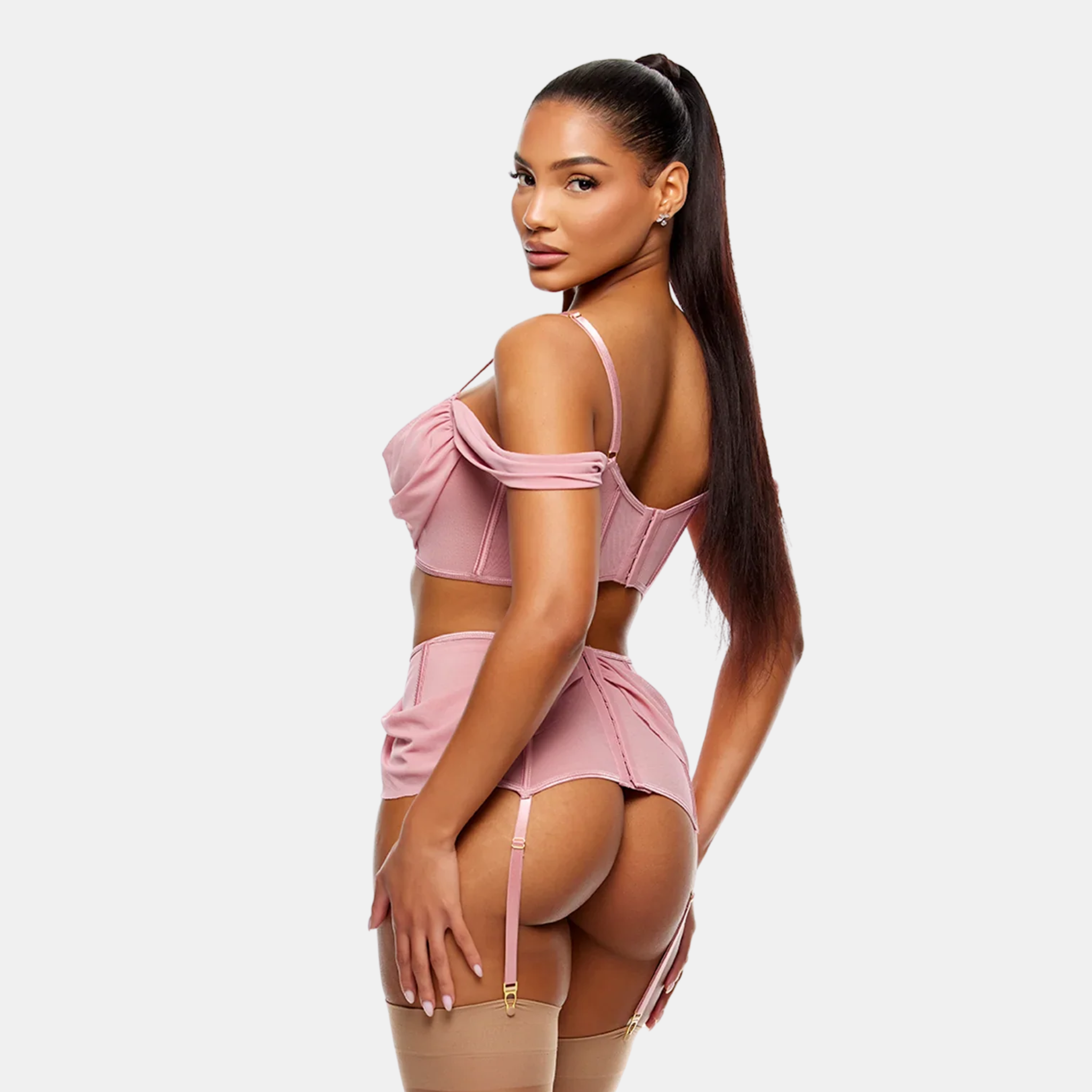 Fallegt undirfata sett úr mjúku efni skreytt glitrandi steinum. Brjóstahaldarann er festur með krækju að aftan & er með hlýrum sem koma yfir axlirnar, hann er með  "off the shoulder" sniði. Breytt og vandað sokkabandabeltið er með áföst stillanleg sokkabönd & er það fest að aftan með góðum krækjum. Einnig fylgir settinu nærbuxur í stíl.