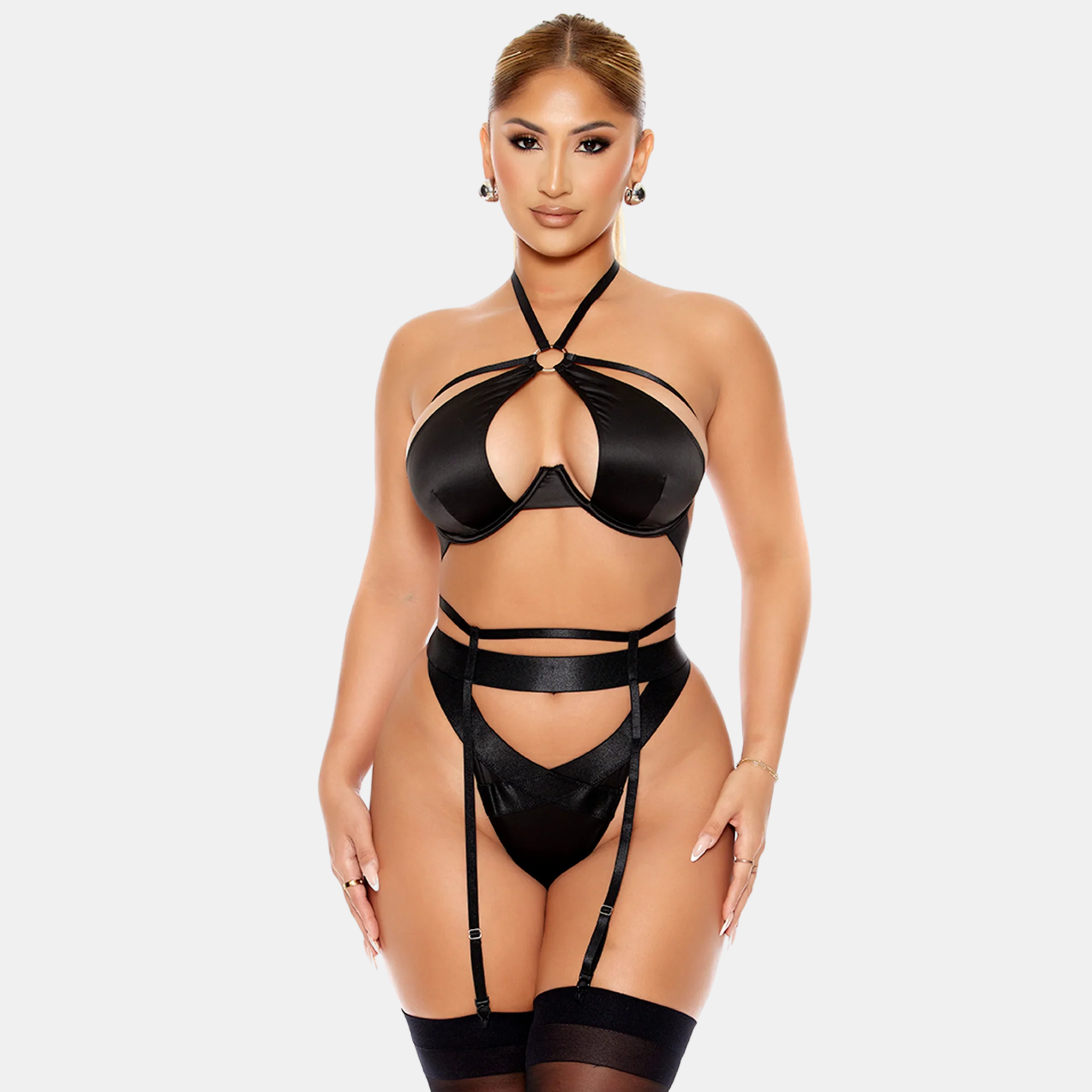 Þessi undirföt eru úr æðislega mjúku satíni & eru með virkilega skemmtilegu sniði. Hálf opin að framan sem dregur athyglina að brjóstunum en spangir & sérstakt snið brjóstarhaldarans gefur þeim bæði góðan stuðning sem & fallega lögun. Brjóstarhaldarinn kemur í lykkju yfir hálsinn sem er föst í gylltann hring að framan. Sokkabandabeltið er fest að aftan & er með stillanlegum áföstum böndum, fallegar satín nærbuxur í stíl fylgja einnig með. Æðislega eigulegt svo ekki sé meira sagt!